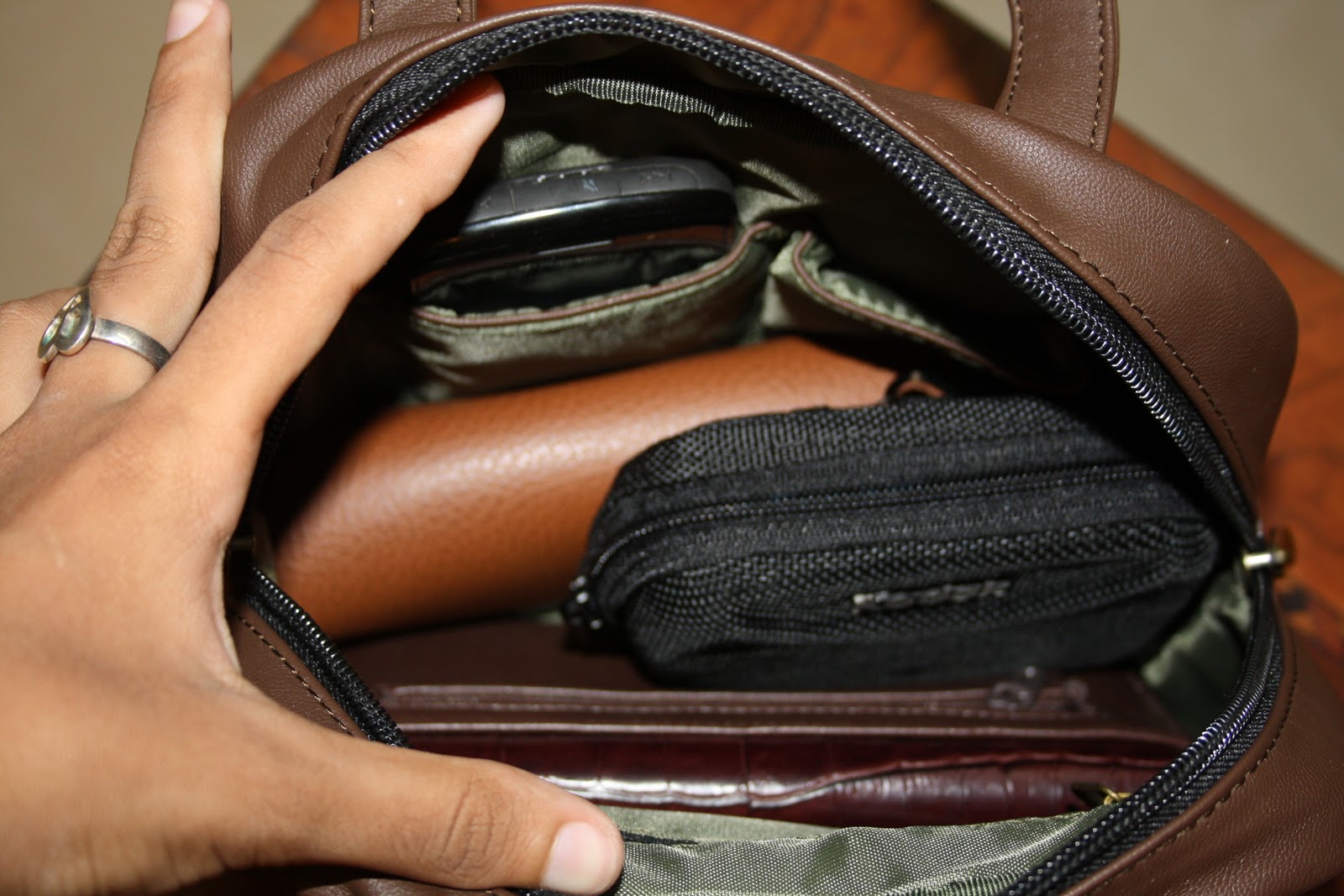 A look at the roomy interior. It has two slot pockets on one side & a zipper pocket on the other. One of the slots fits my BlackBerry like a glove! And the main pocket fits my Ray-Bans, purse & Kodak point-and-shoot with a lot of room to spare).