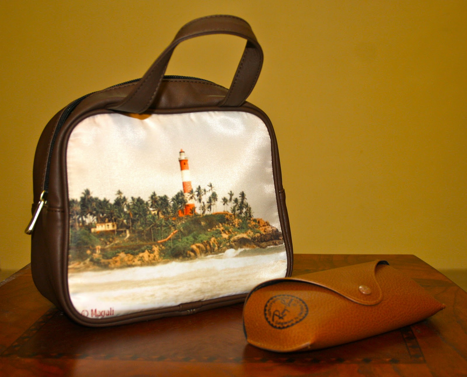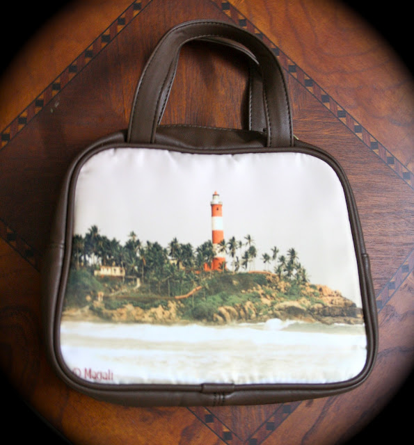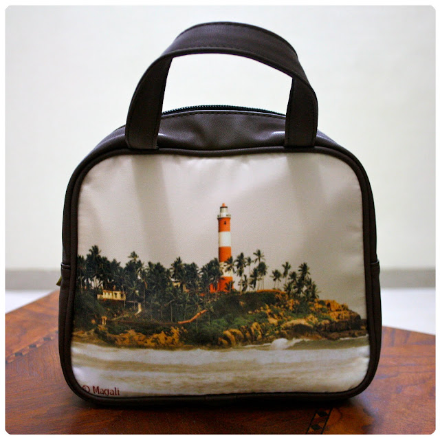 It’s a small little brown leather tote. What makes it special is that one side is printed with a photograph I took of Kovalam lighthouse. The other side is just plain brown leather. I could go for a two side printed bag but I though that would be a bit too much!