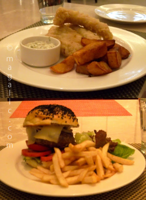 | Dinner at Saptami: Fish & Chips, Sirloin Burger. |