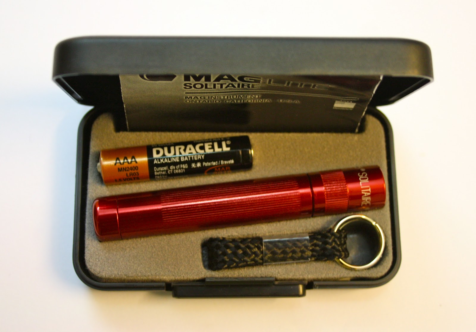 | A look inside the case: a Duracell battery, the maglite & a keychain/lanyard. |