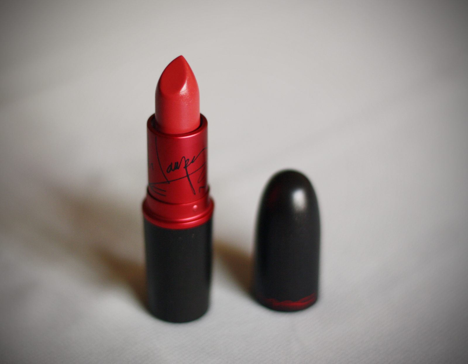 What I  really like about the Viva Glam range is that 100% of what you pay goes to a charity fighting AIDS. The funny part was that I didn’t even care what color is actually was, just that it was Cyndi’s shade (it even has her autograph embossed on the box & tube). Later on I googled & found that most bloggers described it as a ‘wearable red’. I find it closer to a dark pink on my lips, but I love it!