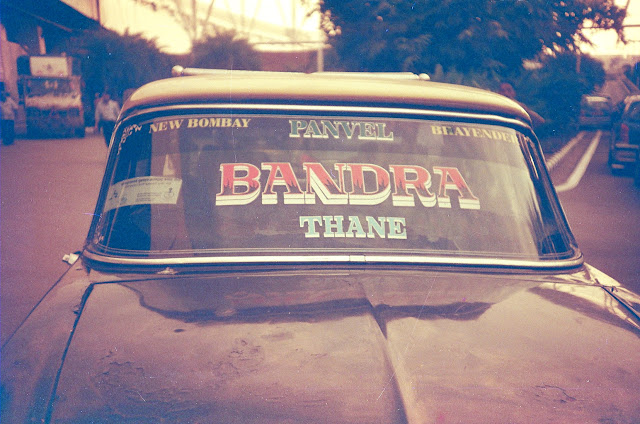 Bombay’s famous yellow & black taxis, with kitschy art naming a few suburbs of Bombay.