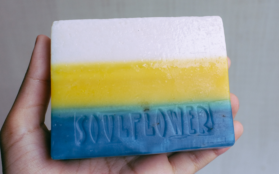 The soap is quite big & Soulflower advises that you cut it into strips to prolong the life (the labelled photo you see below is 1/4th the whole thing, after being used twice). Tea tree oil is the most prominent scent on the soap, but I can smell a little bit of citrus too, from the lemon peel. It does smell a big medicinal, but I really like it. Make sure to keep it dry or it might melt completely.