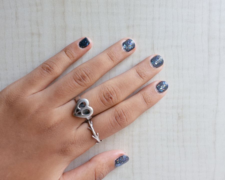 This is the pen – I really like how it feels & looks. It’s quite the no brainer, start with the base polish & top with the flakie (they’re even indicated as 1 & 2).The base polish is charcoal grey (though my parents like to call it black! Orbit in the moon candy range has a black base shade) & goes on very smoothly. In fact, I own had to put one coat to get perfectly even, opaque nails. Even the brush was a pleasure to work with. I’m pretty pleased with the formula & if all Revlon nail paints are like this I see myself buying more soon.