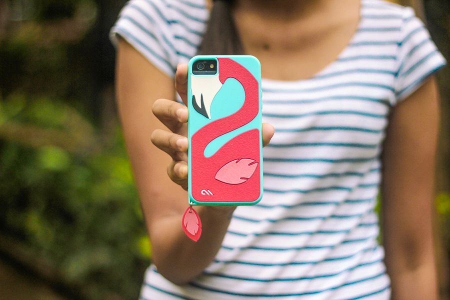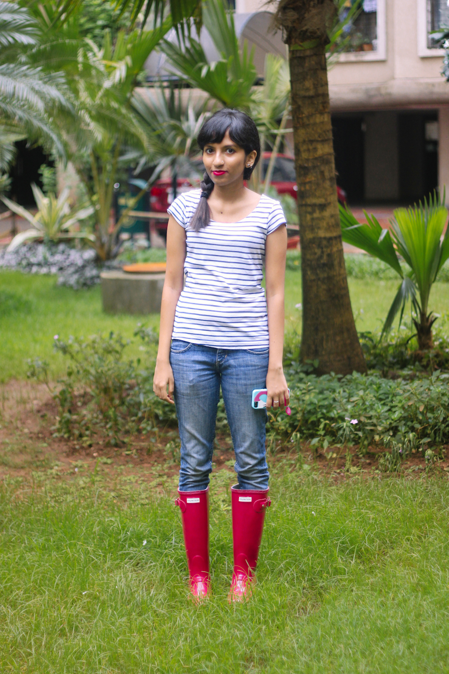 Breton tee from Bandra | Lee Jeans | Case-Mate Flamingo iPhone case* | Original tall gloss Hunter boots {in cranberry}
