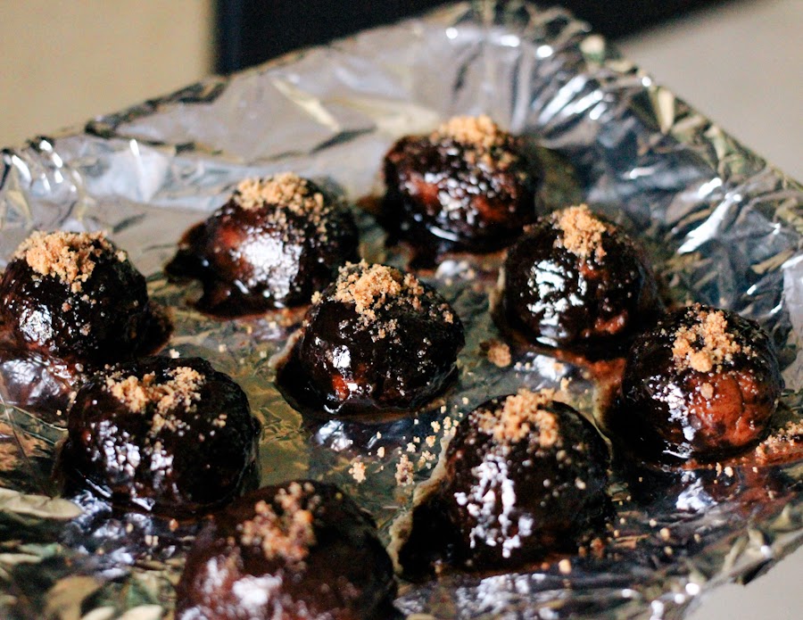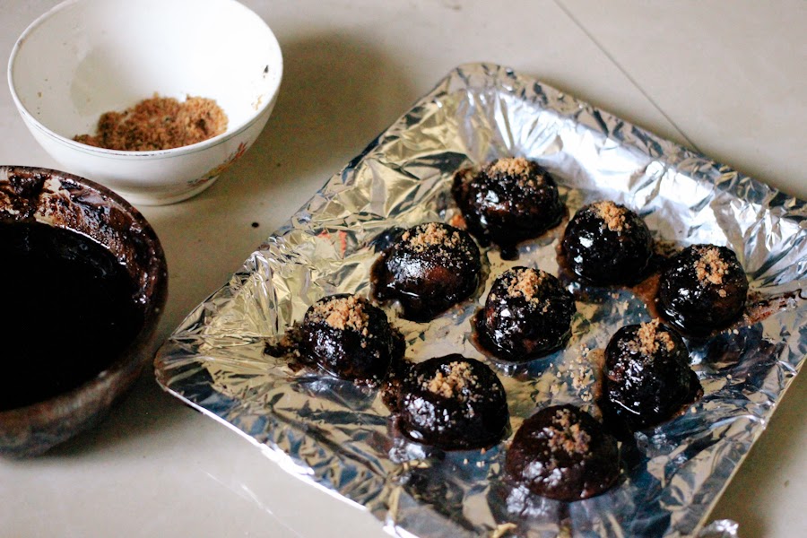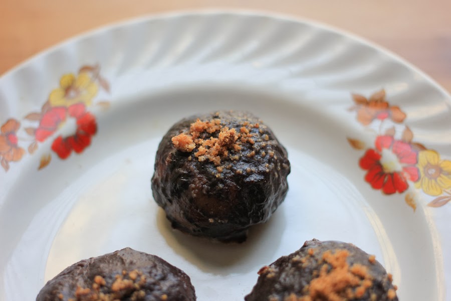Take a baking tray (or any plate for that matter) & cover it with butter paper or aluminium foil. Arrange the formed truffles neatly then sprinkle the conserved cookie crumbs from earlier!