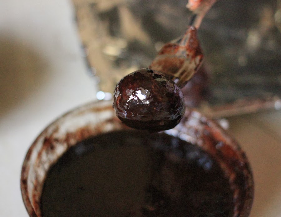 Next, you need to melt your chocolate. The chocolate above is dark but it was a real pain to melt so I recommend milk chocolate. The best way to melt it to put it in a glass bowl & zap it in the microwave. Start with ten seconds, remove & stir, then another ten seconds till it’s liquid. Chopping or grating the chocolate bar before hand will help it melt faster! Then pick up your truffles with a fork & dip!